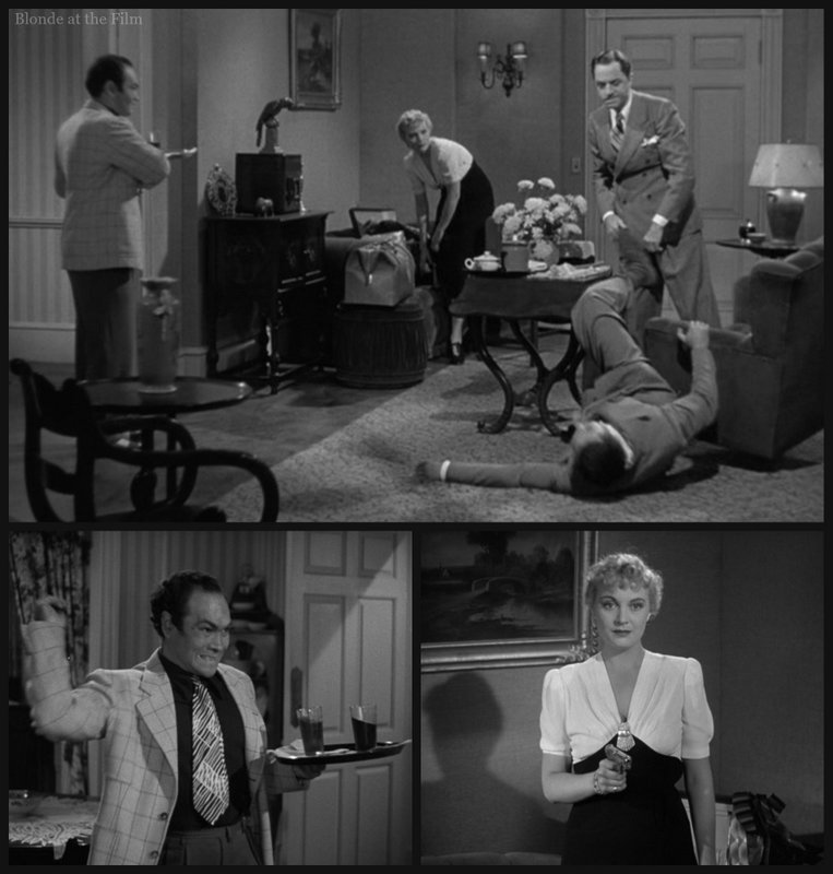 When Nick and Nora finally get to the house, they chat with the Colonel, his adopted daughter (the “adopted” part is emphasized), Lois (Virginia Grey), and her fiancé, Dudley (Patric Knowles), who works at the Colonel’s company. The man to the right of the Colonel is his secretary, Freddie (Tom Neal). Don’t worry, all of these characters will eventually get their own backstories and potential motives…You can watch the Charles’ arrival here.