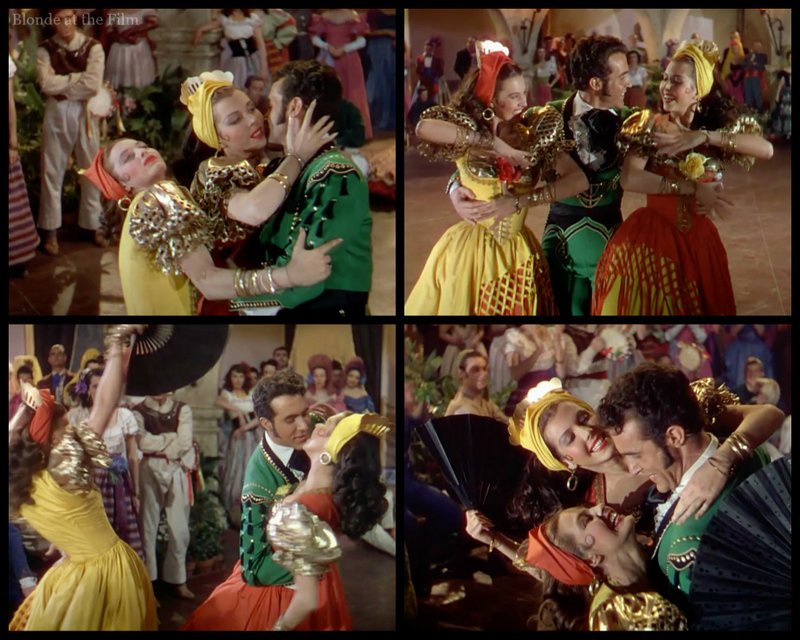 Ricardo returns to the fiesta in time for a dance interlude featuring Ann Miller, Cyd Charisse, and Ricardo Montalban in “The Dance of Fury.” It’s one of the best scenes in the movie, and an unusual pas de trois.