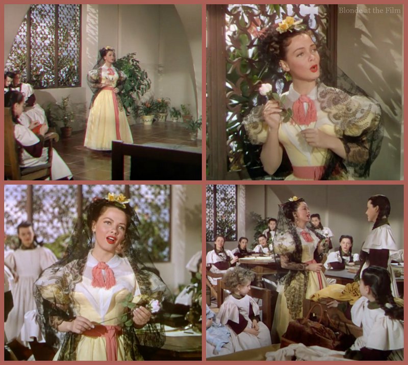 Meanwhile, in a nearby convent school, lovely Teresa (Kathryn Grayson), the Governor of California’s daughter, prepares to leave for good. She sings to her former schoolmates that “Tomorrow means romance for me!” She’s a silly, romantic girl who thinks that her true love will appear the day she leaves school. You can watch the song here.