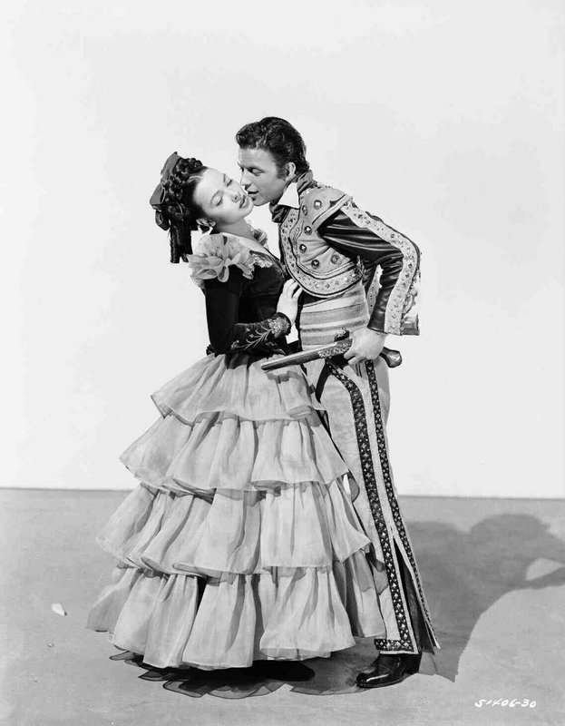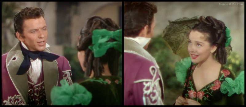 Walter Plunkett designed the costumes for this film. He is most famous for Gone with the Wind (1939) and Singin’ in the Rain (1952), but he worked on many of the period films at MGM. He goes wild with color and riffs on the traditional mantilla and peineta (veil and comb combo) on nearly all the female characters. He reserves the sparkles for the actors’ outfits, so get ready. Fortunately for fans of visual splendor, accuracy was not a priority for Plunkett. Nor anyone else on the production.