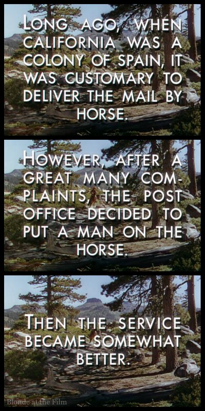 To the film! It opens with credits over a scenic vista that looks an awful lot like the wilderness in Out of the Past (1947). That movie was shot at Lake Tahoe and other locations in the High Sierras. According to AFI, some scenes in The Kissing Bandit were filmed around Sonora, California just south of Lake Tahoe. So it could be.