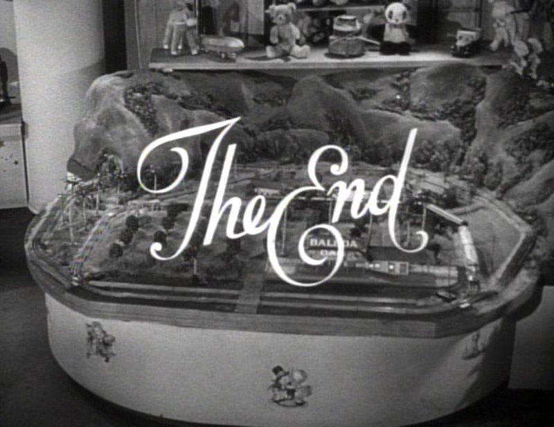 The clever opening of the film is echoed when the real train turns into a toy train for the end credits. Cute! And kind of cool because it undoes the “reality” of the movie, and reminds you that the film world is as false and constructed as a toy train set. But no less fun!