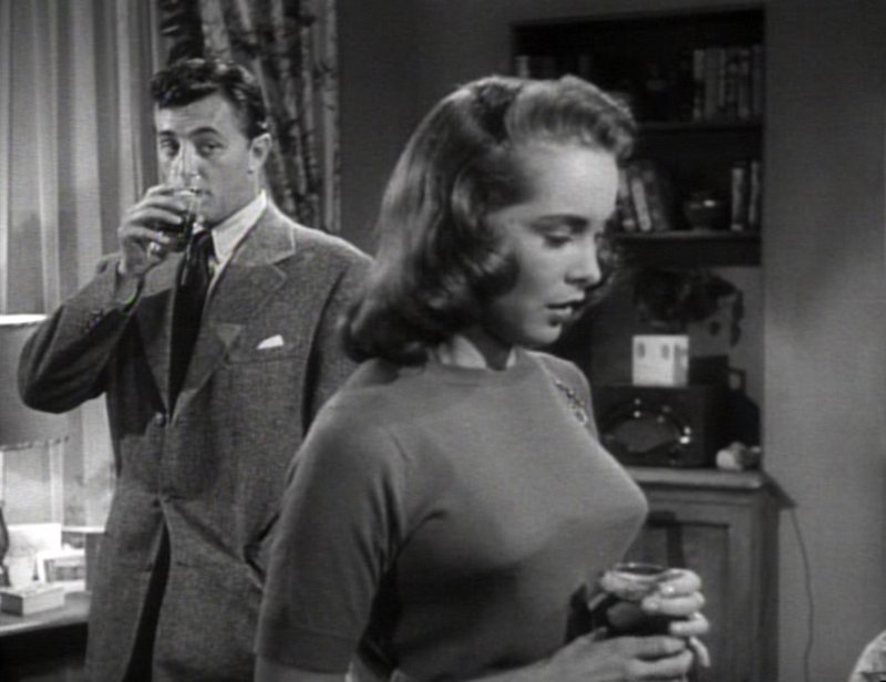 So now Steve and Connie are alone with their cocktails. And her incredibly pointy boobs. Leigh was one of the famous “bullet bra” wearers and sports the cone-shaped bras in many of her movies.