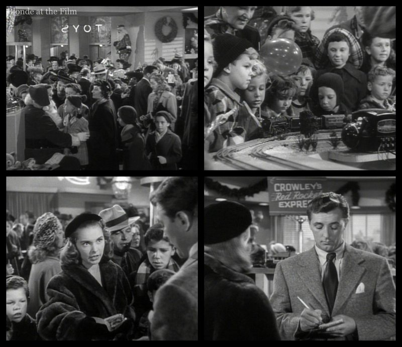 A salesman named Steve Mason (Robert Mitchum) is the conductor of this corner of Crowley’s Department Store. He’s good at selling “Crowley’s Red Rocket Express,” but he’s still surprised when Connie Ennis (Janet Leigh) asks to buy the train without asking a single question or listening to his sales pitch. She even has the correct amount of cash, including the tax, ready to go.