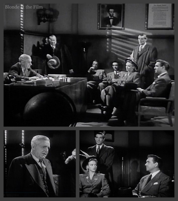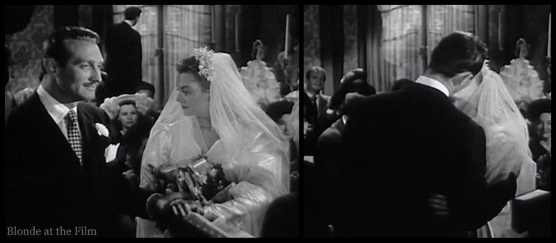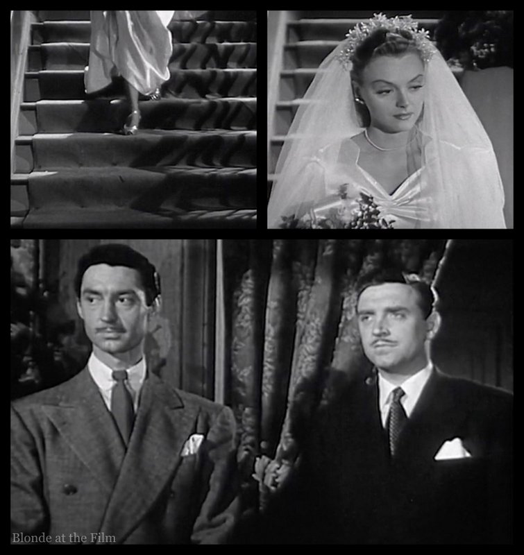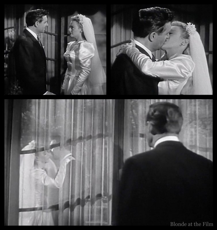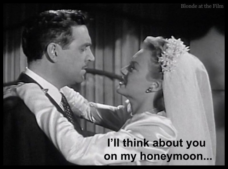 Les Burns (Robert Paige) and Al Herrick (James Griffith) discuss the bride, Claire Cummings (Leslie Brooks), as they wait for her appearance. Both men are reporters at the newspaper where Claire wrote the social column, and both were once in relationships with her. In fact, she gave both men cigarette cases engraved with the same message, just a different name. As we learn through the movie, she probably bought the cases in bulk and had an engraver on standby to fill in the names!