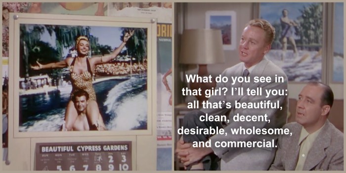 I first watched this scene in Dangerous When Wet when I was about seven-years-old, and it stuck in my mind. Even then, I recognized how unusual it was to see a beautiful movie star shed her glamorous finery and do something so athletic and intense. And it’s still a rare moment all these years later. Besides Sonja Henie‘s ice-skating extravaganzas, can you name any other popular blockbusters that feature an Olympic-caliber athlete showing off her skill and strength? The English Channel swim in Dangerous When Wet is pure toughness—there’s not a sequin in sight—and it puts Esther’s athleticism solidly in the spotlight. That’s what I first noticed about Esther Williams, and what still draws me to her all these years later.