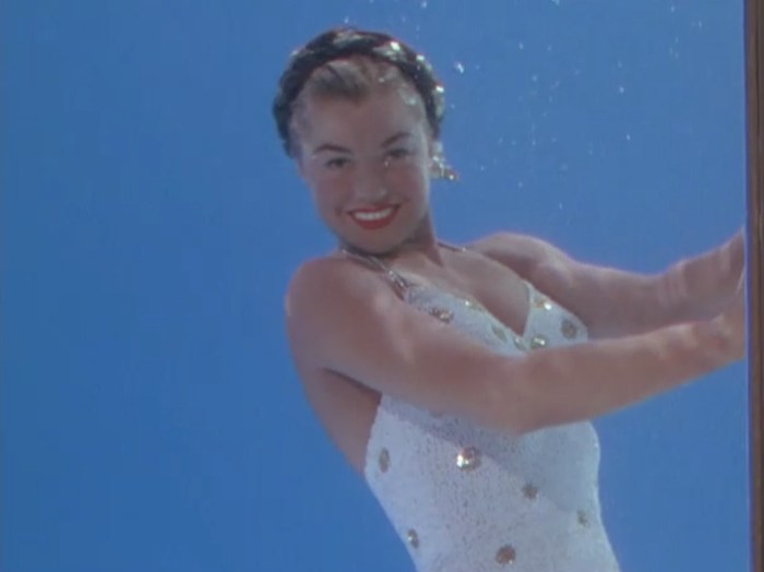 Esther wore a dress made by her sister Maurine, who by 1939 was a mother of two who occasionally earned extra money sewing clothes on the side. The Mermaid did the best she could opposite up-and-coming actor George Montgomery, but she had no illusions about her performance. She never saw the test, but when she met with the head of the casting department a week later (she arrived quite unglamorously on crutches because she had cut her foot at the beach a few days before), he told her “You’re a swimmer, right? Get back in the pool…Rethink your future. It doesn’t include movies.” Esther couldn’t know that he was ridiculously wrong, so his dismissal was enough to convince her that she wasn’t suited for show business. Since it wasn’t something she’d been planning on anyway, it wasn’t too hard to let it go.
