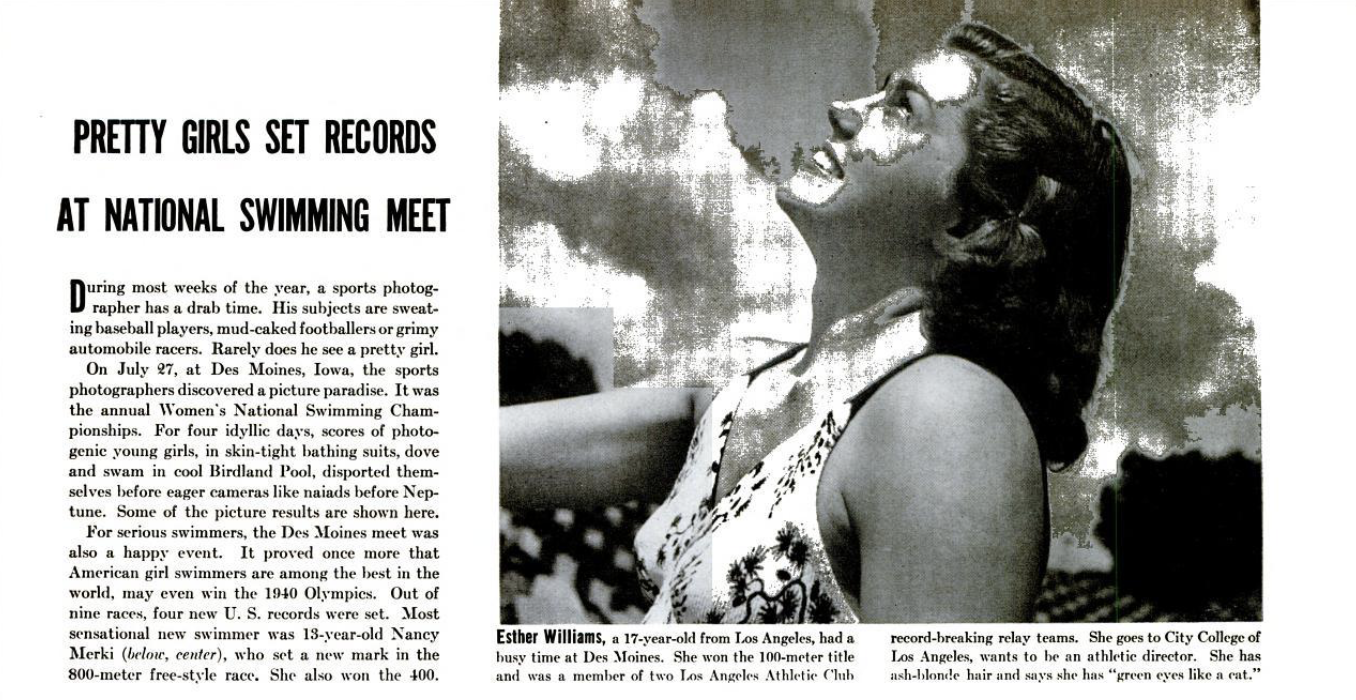 LIFE magazine’s article on the 1939 National Championships was no better. It featured photos of Esther and her competitors with the headline “Pretty Girls Set Records at National Swimming Meet.” The article is even worse than its sexist title, as it focuses on the pleasure sports photographers found at the swim meet: “For four idyllic days, scores of photogenic young girls, in skin-tight bathing suits, dove and swam in cool Birdland Pool, disported themselves before eager cameras like naiads before Neptune.” They were actually there to win races, not “disport themselves” for the cameras, but sure.