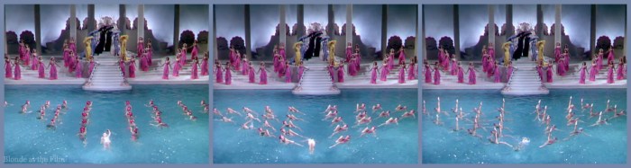 The show was divided into four acts. The first had a “California beach” theme and featured a large water ballet where champion swimmers splashed in choreographed routines along with dozens of other chlorinated chorines. Divers gracefully hurled themselves into the water from gasp-inducing heights atop two diving towers as Morton Downey, a famous Irish tenor, and the well-known Fred Waring Pacific Coast Glee Club sang with a live orchestra. The amphitheater seating allowed the crowd to appreciate the splendor and the kaleidoscopic arrangements of the aquabelles, whom Vogue described as “a little like the Rockettes, a little like the stoic Brünnehildes of the old Hippodrome, they glide and turn with the music, making a complicated, moving mosaic, effortlessly, in the water.” (The kaleidoscopic arrangements of the chorus would become a trademark of Esther’s film ballets, too, especially when overseen by the master of the body-as-geometry overhead shot, Busby Berkeley.)