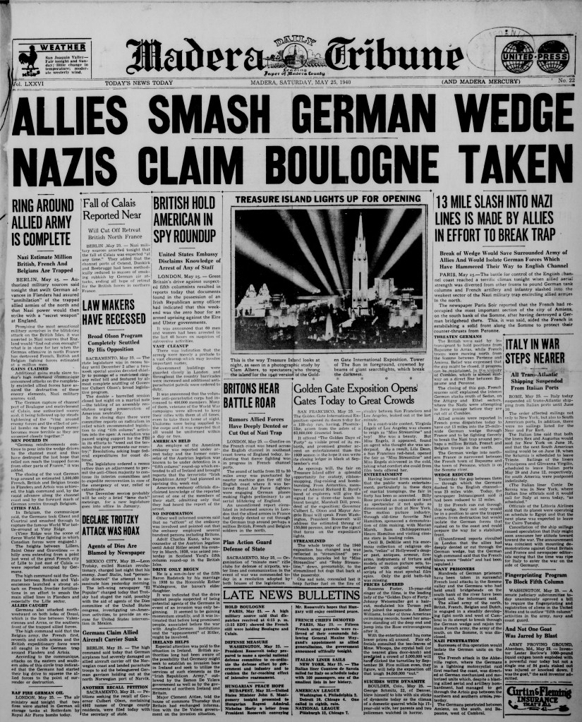 Although it must have seemed a world away from the shimmering pleasure palaces on Treasure Island, Europe was indeed at war. The Nazis had invaded Poland on September 1, 1939 about two months before the Exposition closed its first season, and in the days and weeks that followed, most European nations declared war on the Axis. In early May 1940, as Esther was rehearsing her water waltz with Weissmuller, Winston Churchill replaced Neville Chamberlain as British prime minister, and Germany invaded France, Belgium, the Netherlands, and Luxembourg. And when the Golden Gate Exposition opened on May 25, the Allies were retreating to Dunkirk, and Belgium was three days away from surrendering to Hitler. The contemporary accounts demonstrate this surreal collision: for example, The Madera Tribune’s front page on May 25 was dominated by the huge headline “Allies Smash German Wedge, Nazis Claim Boulogne Taken.” Directly below the block letters is an image of Treasure Island with the caption “Treasure Island Lights Up For Opening.” Given world events, one might have thought that language such as this “As openings will, the fair on Treasure Island offer a splendid opportunity for oratory, ribbon-snapping, flag-raising and bomb-bursting” would have been deemed inappropriate…