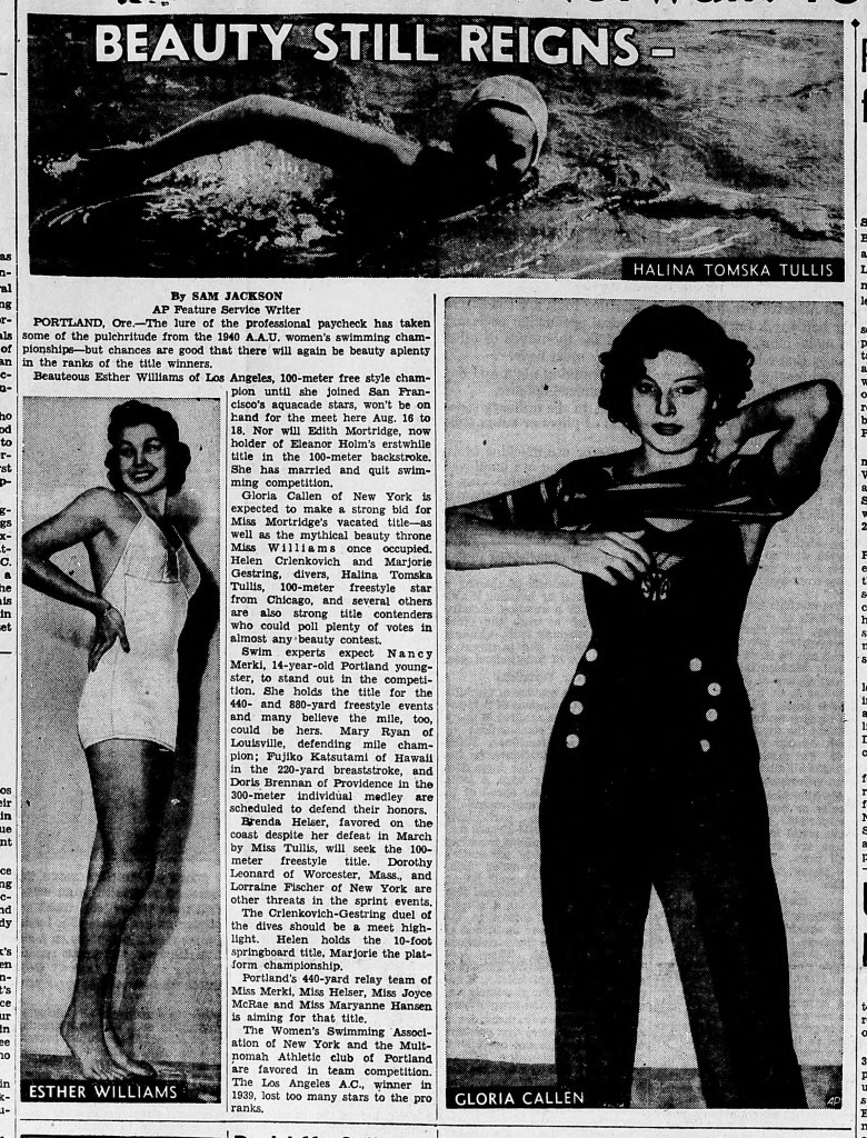 She may not have been focused on the meet, but the sports pages were still focused on her. Despite her absence, a large, full-body photo of Esther in—you guessed it—a bathing suit accompanied an article about the upcoming meet. The story opens with, “The lure of the professional paycheck has taken some of the pulchritude from the 1940 AAU women’s swimming championships…” and first among the missing champions is “Beauteous Esther Williams of Los Angeles…” But the headline “Beauty Still Reigns” reassured readers that even though Esther had turned professional, there were other pretty girls competing in Portland. Thank goodness!