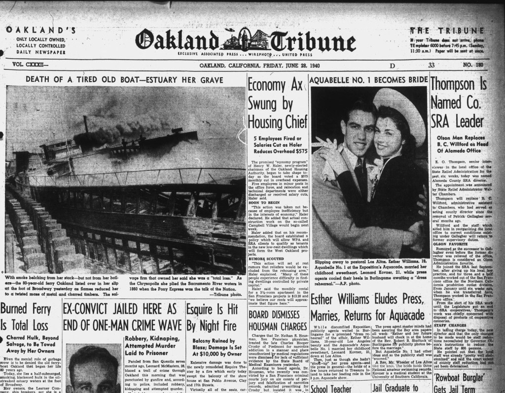 Esther was the last of her siblings to tie the knot, but neither her parents nor her siblings and their families were at the wedding, and it’s unclear if they visited San Francisco that summer. While the youngest Williams kid was lighting up the Golden Gate Exposition, her siblings were busy with their own lives. Maurine Williams Sellstrom, who turned 31 that year, was raising two daughters with her husband Lawrence while working on a PhD in Psychology. June, whom Esther used to bug with her tomboy tendencies as a kid, was also married and was working as a saleswoman. Their brother David and his wife Ruth had a one-year-old daughter.