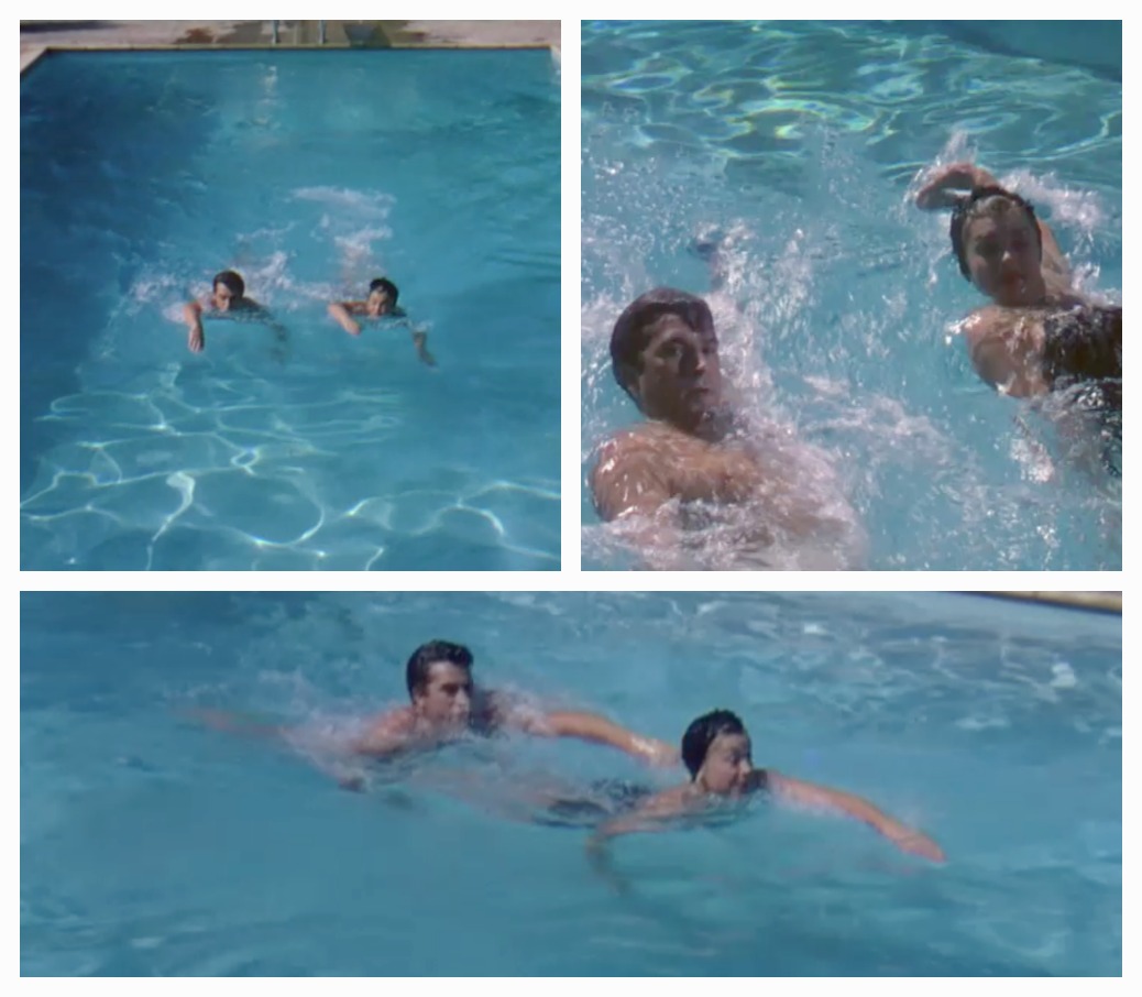 Esther and Leonard were supposed to be married on the morning of June 27th in Burlingame, a picturesque town on the coast just south of San Francisco in San Mateo county. But while photographers and reporters waited at the reverend’s home that Thursday morning, Esther and Leonard headed further south to Los Altos, a town between Palo Alto and Cupertino. Esther wore a dark, knee-length suit with a large orchid corsage and a pale saucer hat. Leonard, dark-haired and slim, wore a light suit and dark tie. A Reverend Wheeler performed the brief ceremony, and the newlyweds returned to San Francisco so that Esther could perform in the 3pm show. (Remember, the Aquacade was presented every weekday at 3pm, 7pm, and 9pm, with a fourth show added on weekends and holidays!) In photos released to the newspapers, the newlyweds embrace tightly and smile at the camera. She was about six weeks shy of her nineteenth birthday, and he would be twenty-one in September.