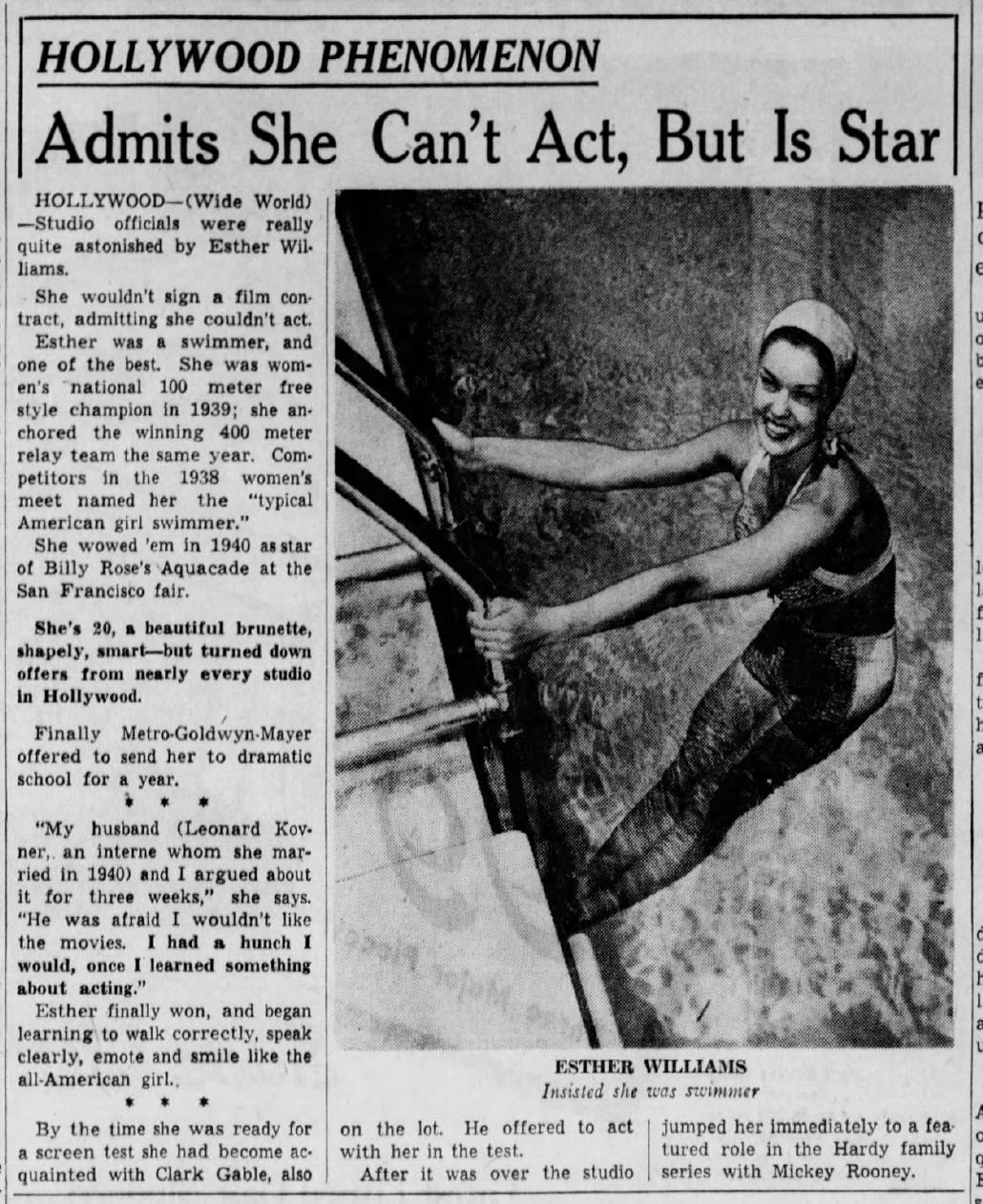 Adding to this “accidental star” thread of her persona was Esther’s dim view of her acting talents. She confessed that she couldn’t act but promised to try her best, and unfortunately this admission got wide play in the papers and stuck to her for years. Variations on the headline “Admits She Can’t Act, But Is Star” and “‘I can’t act—I’m a swimmer,’ she insisted” appeared nationwide in newspapers and fan magazines in 1942 and beyond. One might be surprised that such an insecure, unflattering comment got past MGM’s publicity agents, but it did fit into their carefully crafted narrative of Esther as a normal girl who didn’t struggle for nor particularly desire fame, which is why MGM had to chase her for so long. Her stardom was both accidental and pre-ordained: Hollywood glory was inevitable thanks to Esther’s beauty and charisma–whether she liked it or not!