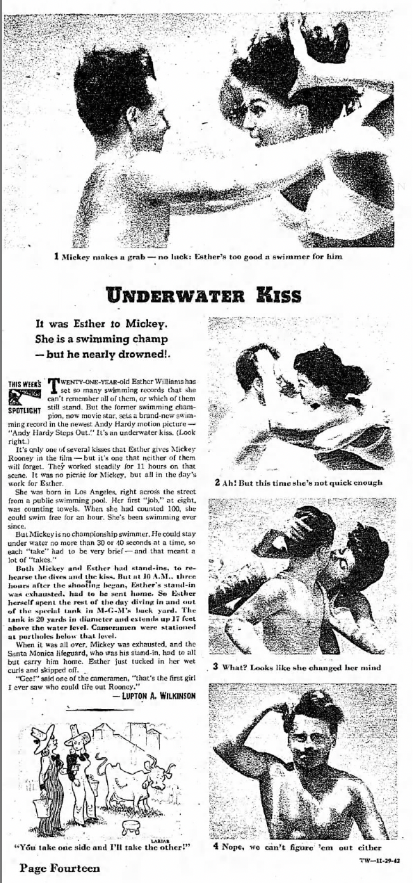 Andy soon follows Sheila into the pool, and the pair share an underwater kiss. It was lovely and sexy and show stopping. And MGM knew it. The publicity department began touting the scene and their swimming starlet months before the movie premiered. The Esther Williams-Mickey Rooney smooch inspired a rumination on the different types of onscreen kisses in Photoplay in October, and a Los Angeles Times article included four photos from the scene and an extended breakdown of how they captured the kiss.
