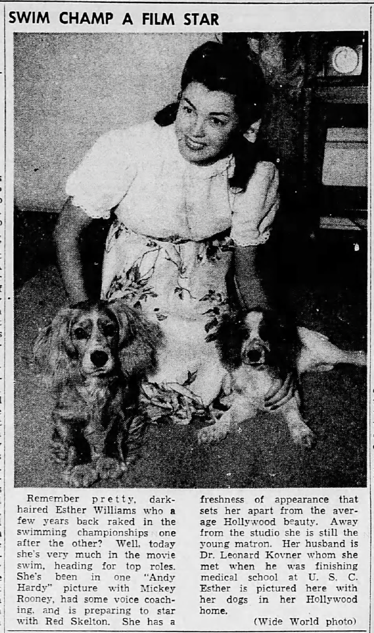 The fan magazine Modern Screen took it even further in a cover story in 1946: the caption of a photo of Esther with Leonard read, “Her marriage to Dr. Leonard Kovner ended on a ‘we’ll always be pals’ note.” This despite the “mental cruelty” charge that was widely reported at the time. But such inconvenient acrimony was hardly an obstacle for MGM’s press agents.
